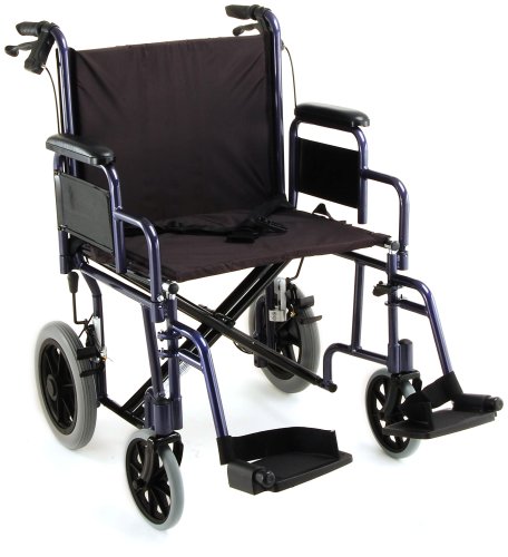 Our NOVA 332B, 22" Transport Chair (HEAVY DUTY and EXTRA WIDE) is designed to provide easy, lightweight patient transport. 12" rear wheels provide a more comfortable ride. The comfortable padded upholstery and arm pads are reinforced to prevent stretching or ripping. It features Detachable/Reversible desk arms. Hand Brakes provide optimum safety and control. For added safety a seat belt is included and each chair is equipped with locking rear wheels. The lightweight aluminum frame (33lbs.) makes loading easier. The quick-release, fold-down back allows the chair to fit compactly into small areas. It has non-skid footplates with heel loops. All chairs have removable swing-away footrests and a limited lifetime warranty on the frame.You will not be disappointed with NOVA 332 Lightweight Transport Chair with Detachable Arms, Hand Brakes and 12" Rear Wheels, 22", Blue